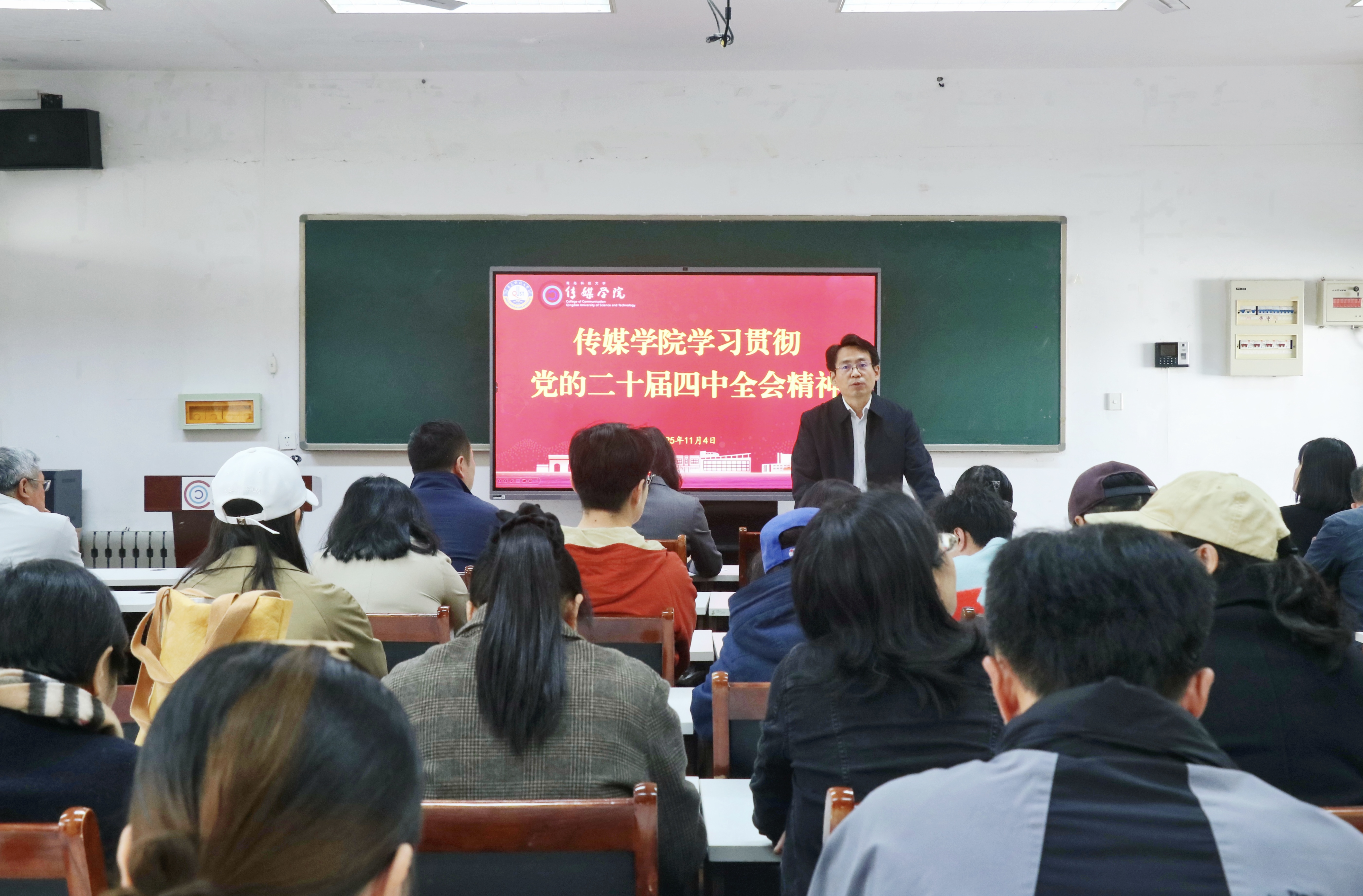 孙洪广就学习贯彻党的二十届四中全会精神提出三点意见:一是强化理论武装,在学深悟透上下真功夫。学院党委、各党支部、全体师生要将学习贯彻党的二十届四中全会精神作为当前首要政治任务,制定实施方案和学习计划,通过“三会一课”、主题党日等多种形式,推动学习教育全覆盖、见实效。二是立足学科专业,在服务大局上彰显特色。要引导师生把思想和行动统一到党中央决策部署上来,聚焦科技传媒的学科特色与发展方向,将人工智能等前沿科技融入教学科研与创作实践,推动学科交叉融合。加强有组织教学、科研,培养卓越传媒人才,产出标志性成果。三是发挥国际优势,在开放办学中提质增效。要将学习成效转化为推动学院各项事业高质量发展的生动实践,充分发挥学院国际化办学的平台优势,将学习贯彻全会精神与拓展国际视野相结合,在开放包容中促进师生成长成才,展现“青科传媒”新担当。