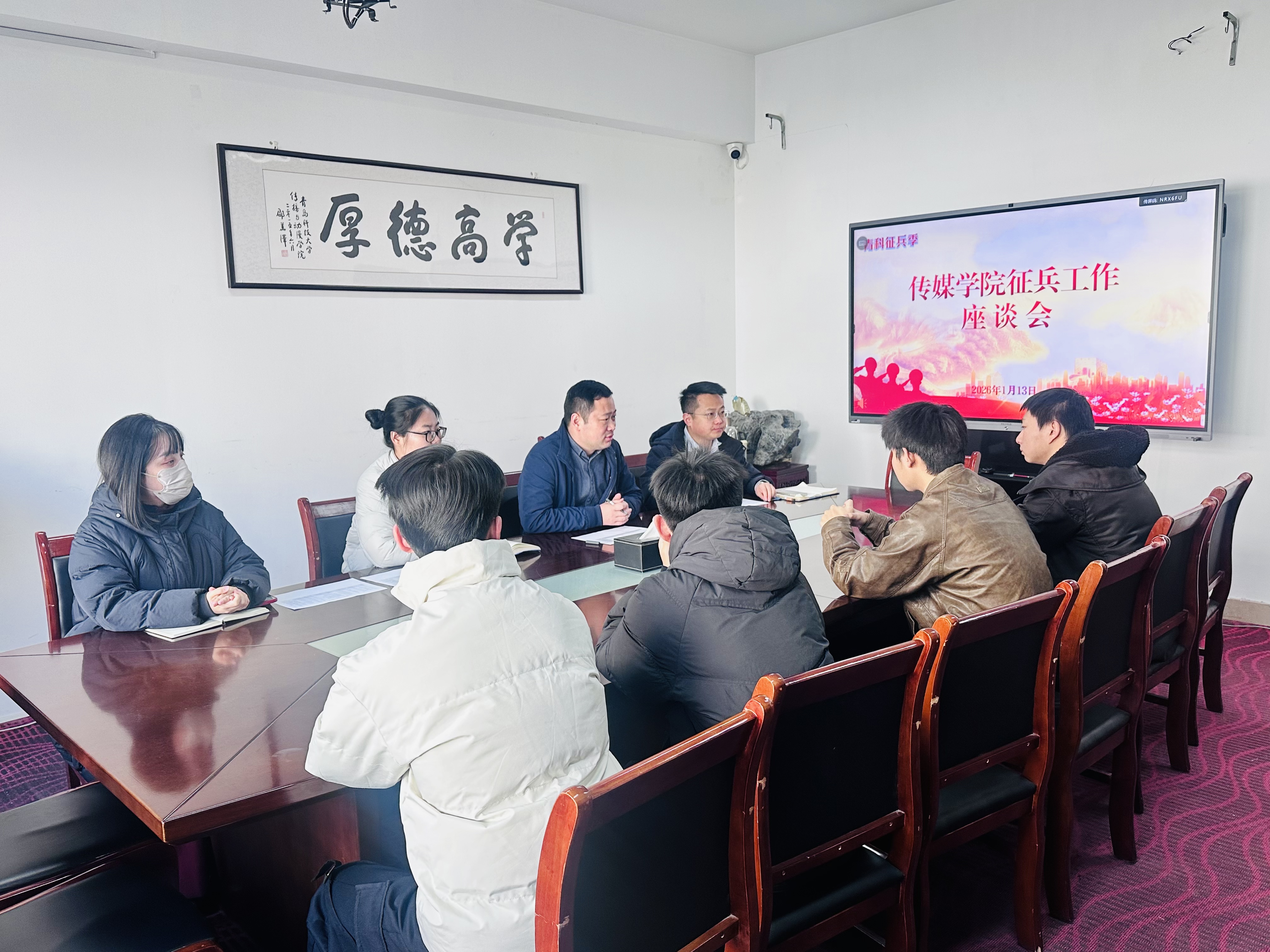 召开征兵工作座谈会。学院党委副书记兼副院长刘海波、团委副书记兼学工办副主任金莹莹、张鸣、本科毕业生辅导员刘福民,以及报名2026年春季征兵的本科生齐聚一堂,共话参军理想,详解征兵政策。